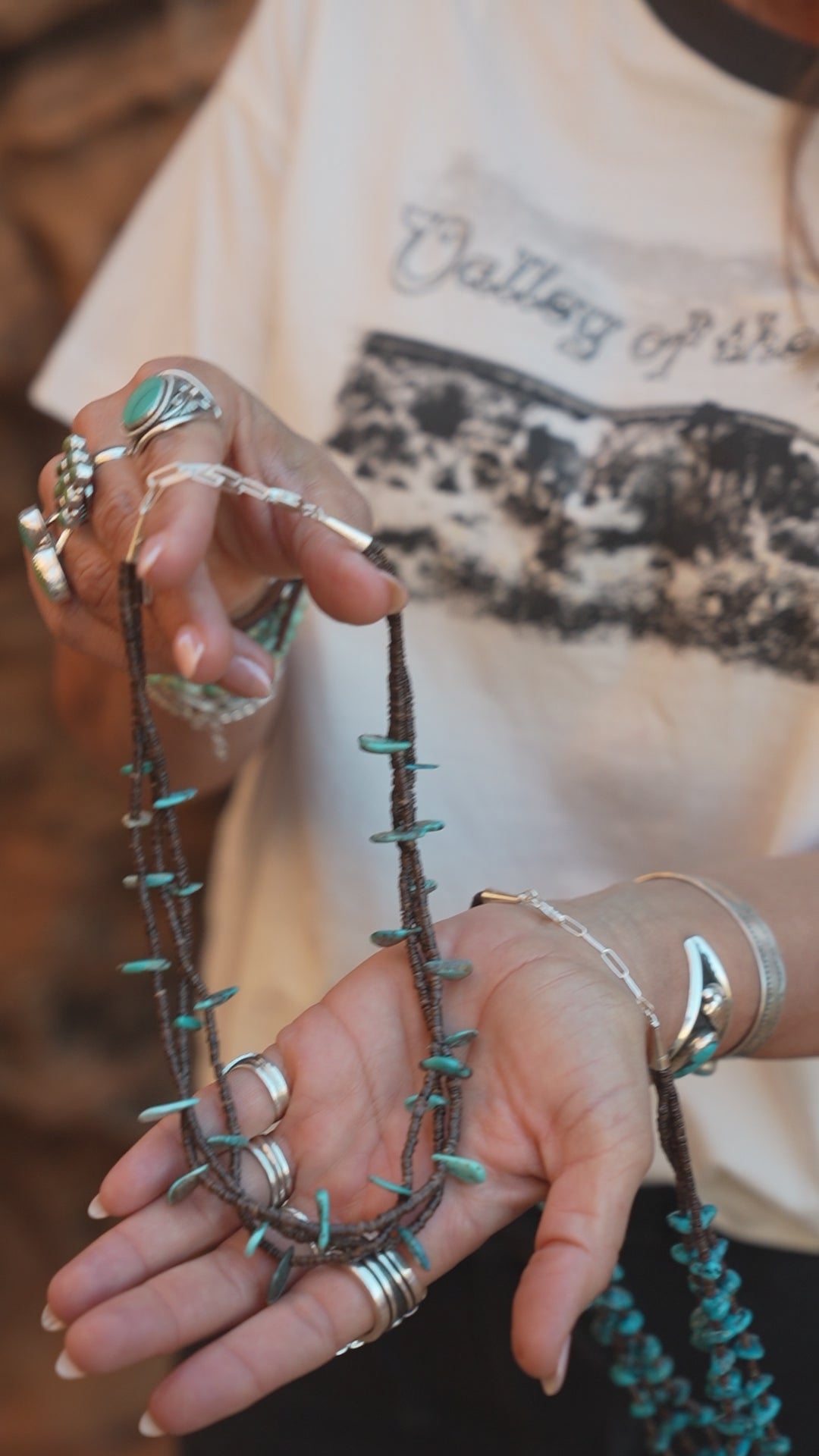 The Native American Marquez Tachiini Olive Heishi Kingman Teardrop 2 Strand Necklace is a meticulously handcrafted piece featuring two strands of olive E Kingman teardrop beads. Secured with sterling silver clasps, this necklace exemplifies traditional Navajo artistry, ensuring both durability and cultural authenticity.